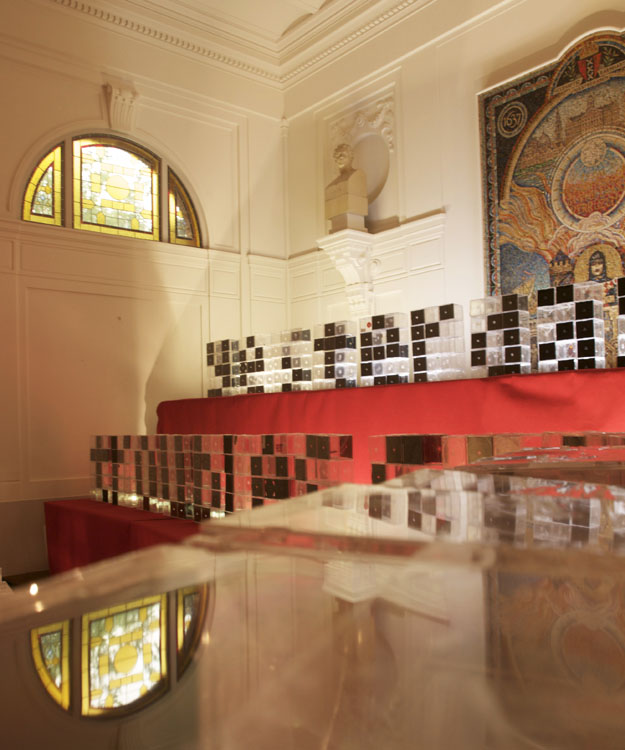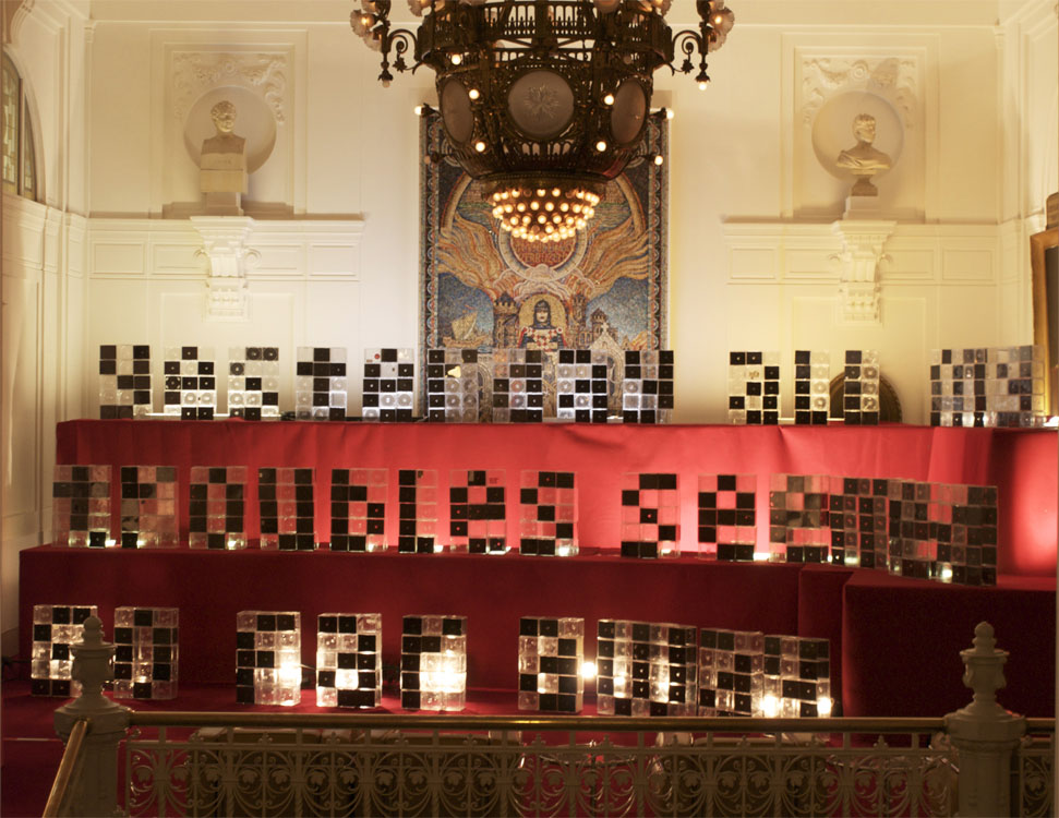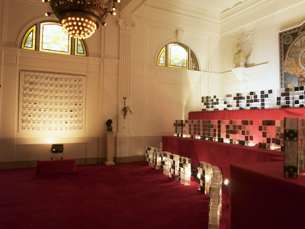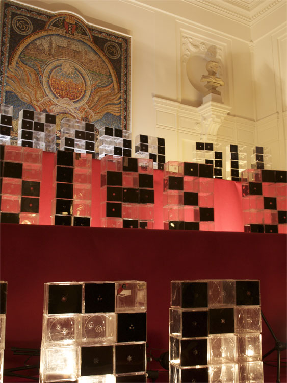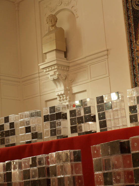 I was asked to build up the Plastic Domestic project for the symposium Overvloed (abundance). An event organized by Happy Chaos where people from multiple disciplines such as politicians, poets and disco-idealist where able to discuss this topic. The classical decor of the Stadsschouwburg Amsterdam (Amsterdam based Theatre) gave an interesting contrast with the modern appearance of the Plastic CD cases.