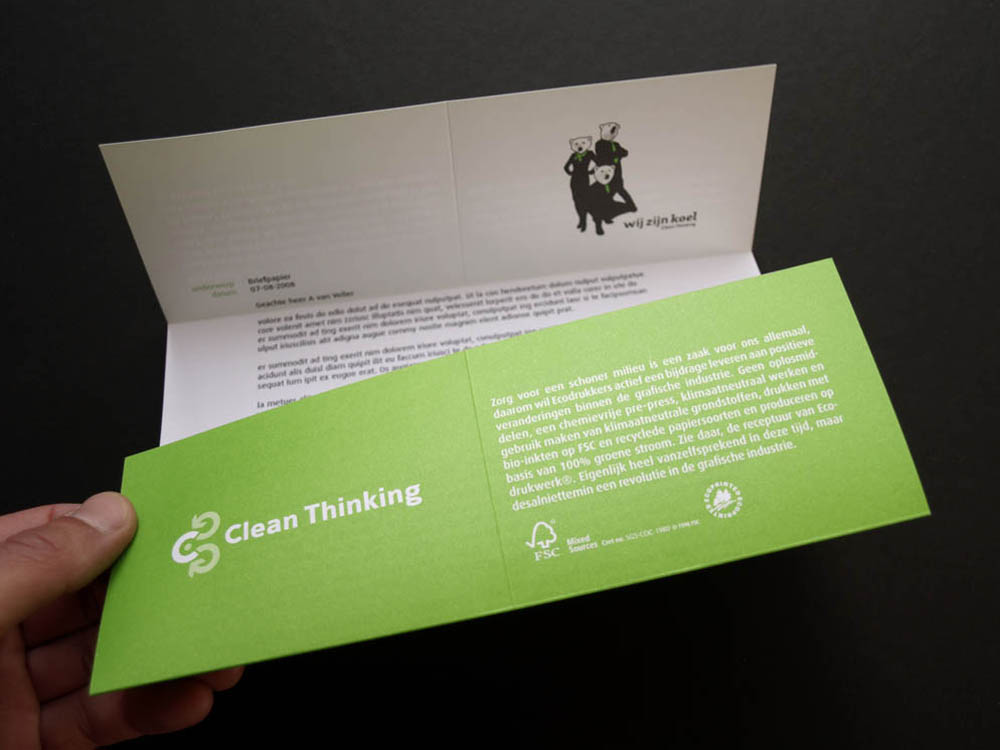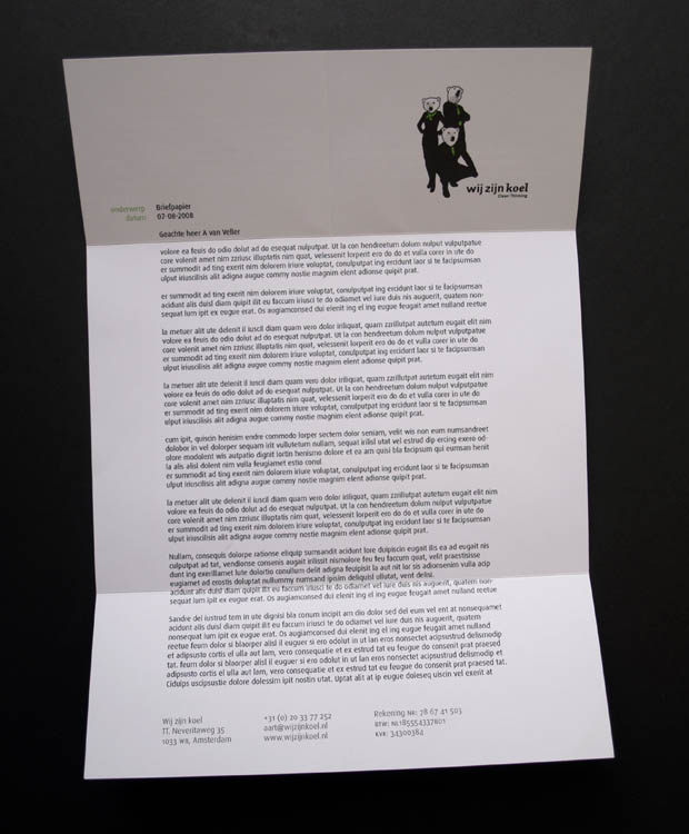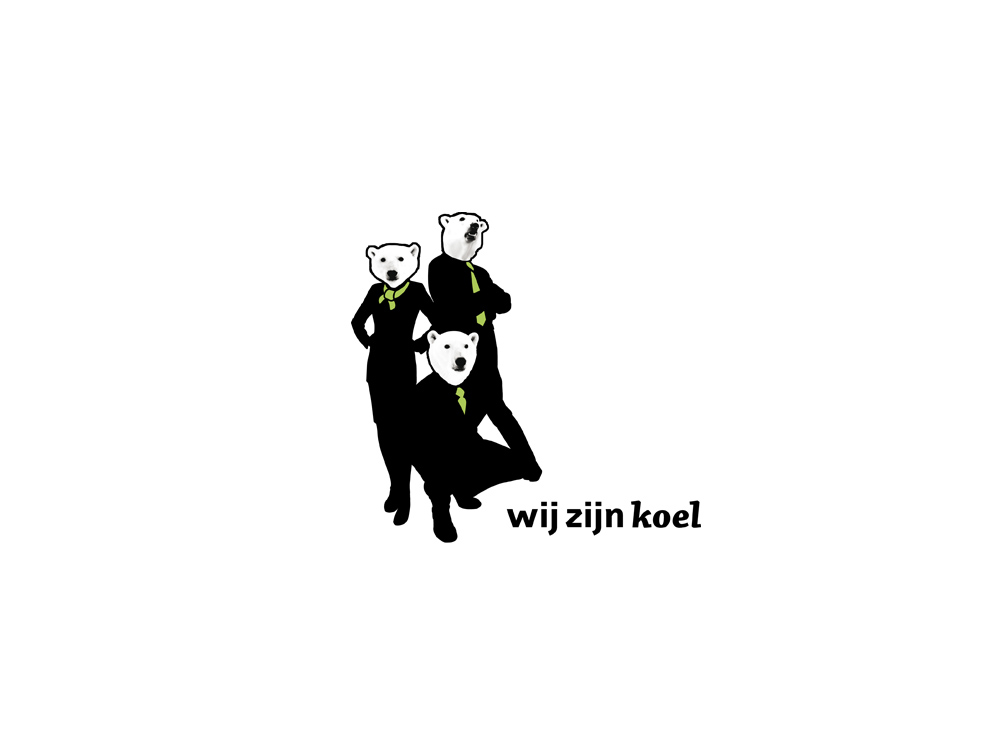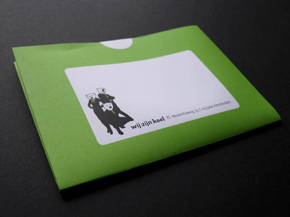 Being in the process when the first ideas of ‘Wij zijn koel’ were being spread, I was able to come up with the whole identity of the company, including the name. This refers not only to the ‘cool’ and young structure of the company it also communicates a positive reaction against climate change and the heating of the earth. The polar bears represent the advocates of our precious world. To spread the awareness that besides being necessary it is absolutely fun and affordable to work in a sustainable way. I designed the stationary according to the ‘Clean Thinking’ method. The letterhead and the envelope are made out of one single sheet of paper. The business card is printed on Cradle 2 Cradle 285 grams Polyart, in theory this could be ‘upcycled’ again.